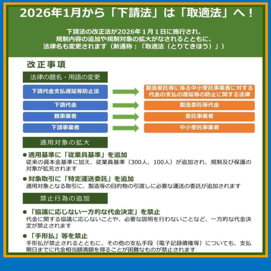 発注者・受注者の対等な関係に基づき、事業者間における価格転嫁及び取引の適正化を図るための「下請代金支払遅延等防止法及び下請中小企業振興法の一部を改正する法律」が「製造委託等に係る中小受託事業者に対する代金の支払の遅延等の防止に関する法律」(略称:中小受託取引適正化法、通称:取適法)となりは、令和8年1月1日から施行されます。
