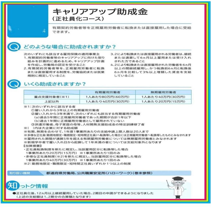 有期契約労働者等を正規雇用労働者に転換または直接雇用した場合に受給できます。 F […]