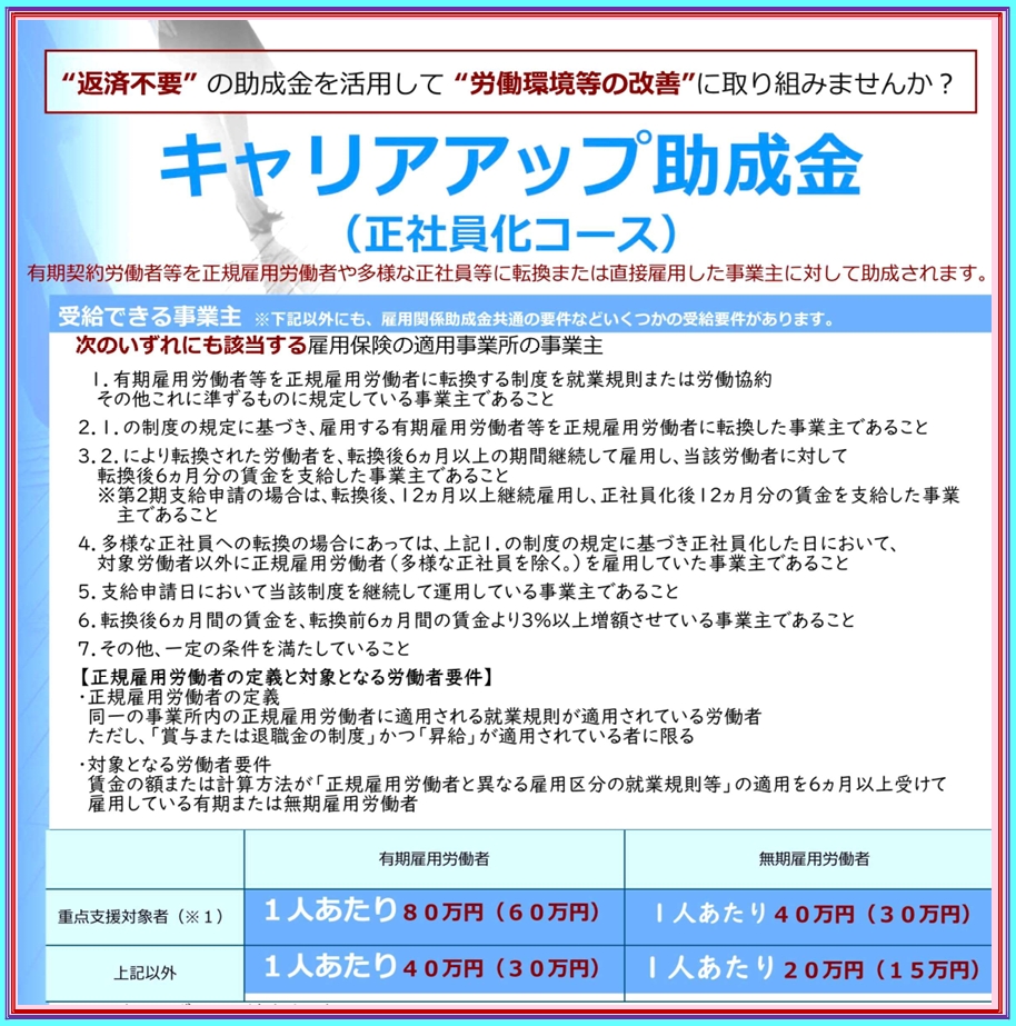 有期契約労働者等を正規雇用労働者や多様な正社員等に転換または直接雇用した事業主に対して助成されます。