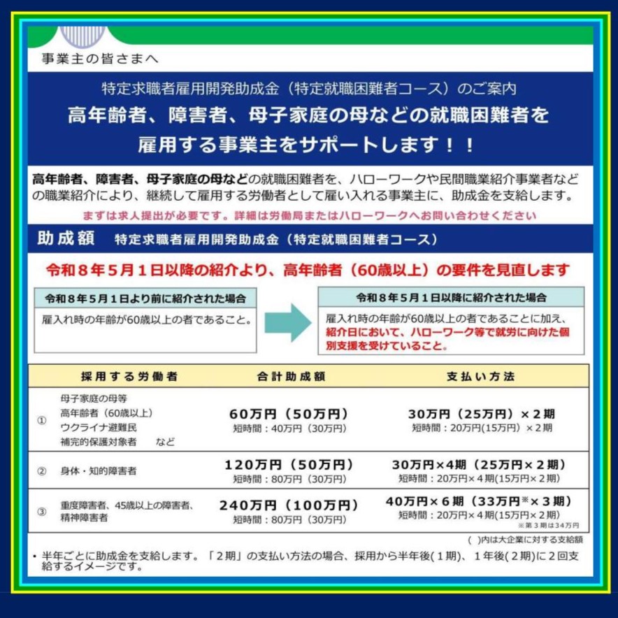 特定求職者雇用開発助成金の高年齢者の要件が見直され、令和8年5月1日以降は、ハローワーク等において就労に向けた個別支援を受けている高年齢者(60歳以上)の方が特定求職者雇用開発助成金の対象労働者となります。