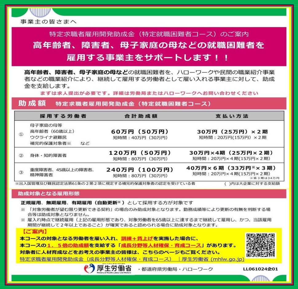 高年齢者、障害者、母子家庭の母などの就職困難者をハローワークや民間の職業紹介事業者などの職業紹介により、継続して雇用する労働者として雇い入れる事業主に対して、助成金(特定求職者雇用開発助成金~特定就職困難者コース)が支給されます。