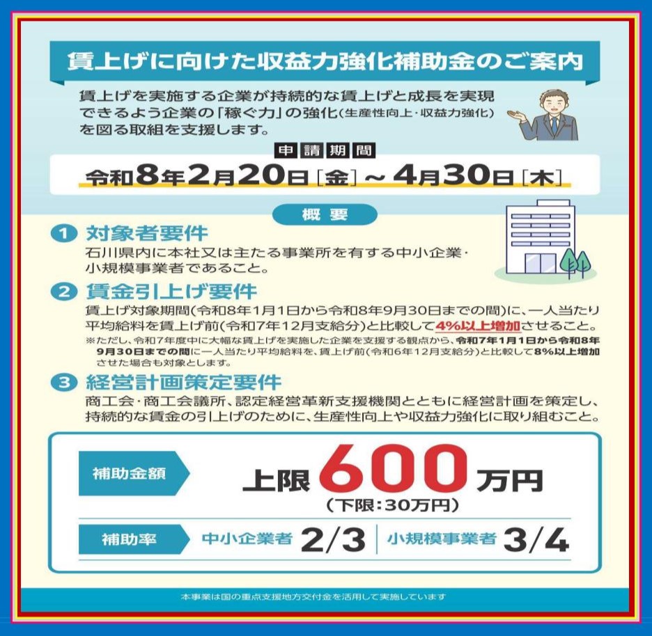 石川県では、賃上げを実施する企業が持続的な賃上げと成長を実現できるよう企業の「稼ぐ力」の強化(生産性向上・収益力強化)を図る取組を支援する、としています。