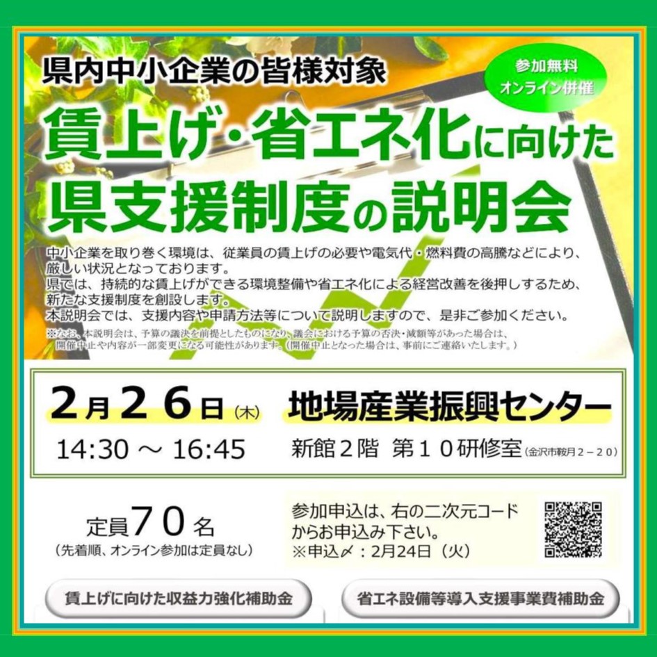 石川県では、持続的な賃上げができる環境整備や省エネ化による経営改善を後押しするため、新たな支援制度を創設し、その支援内容や申請方法等についての説明会が開催されます。